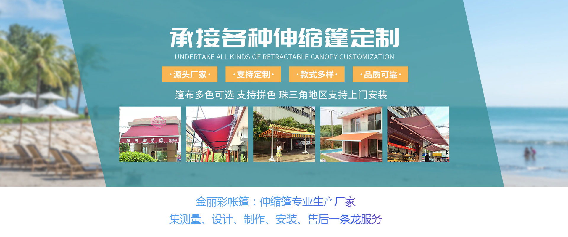 中山市金麗彩帳篷有限公司成立于2002年,是一家集遮陽篷配件生產(chǎn)、批發(fā)戶外休閑用品的專業(yè)彩蓬安裝制做工程公司,在廣東地區(qū)擁有大量彩樣板工程實(shí)例,公司技術(shù)力量成熟,專注承接定制制作安裝各種遮陽、遮雨、固定或活動(dòng)蓬、展覽蓬、鋁合金無線遙控電動(dòng)蓬、廣告蓬、歐式造型蓬、戶外休閑傘等產(chǎn)品。本公司還可以根據(jù)用戶需求制作各款大型戶外停車場帳蓬、款式新穎、質(zhì)量可靠、價(jià)格實(shí)惠。公司位于中國廣東省中山市沙溪鎮(zhèn),交通方便,物流快捷。金麗彩帳篷本著“客戶為先,誠信至上”的原則,熱誠歡迎各界朋友前來我司參觀、考察、洽談業(yè)務(wù)。